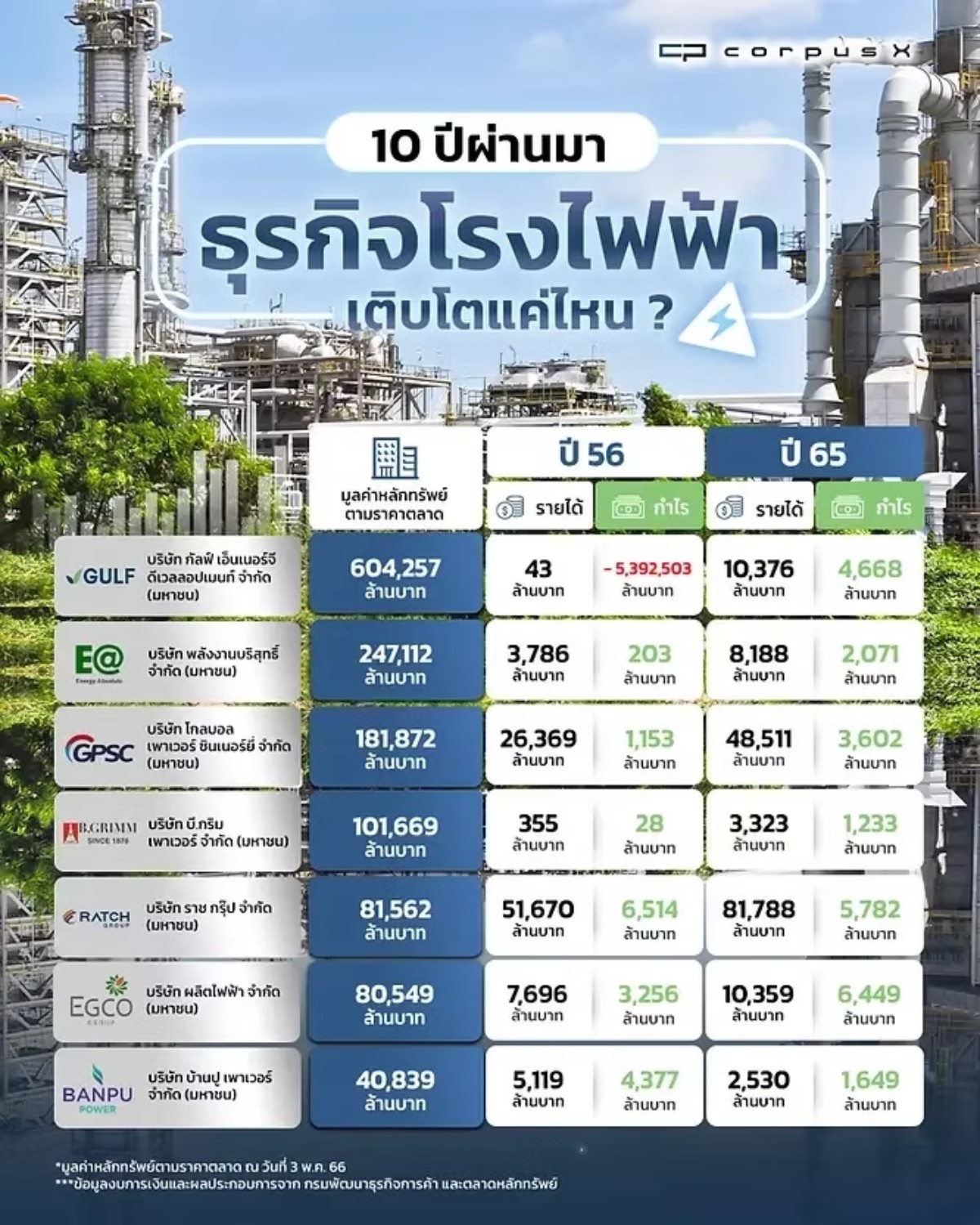 มาถึงตรงนี้อาจมองเห็นภาพรวมของธุรกิจโรงไฟฟ้ากันพอสมควรแล้วว่าเป็นอย่างไร ต่อมา Corpus X จะพาคุณมาสำรวจธุรกิจโรงไฟฟ้า ผ่านแต่ละบริษัท ว่าในช่วง10 ปีที่ผ่านมามูลค่าบริษัทเติบโตแค่ไหนกันบ้าง