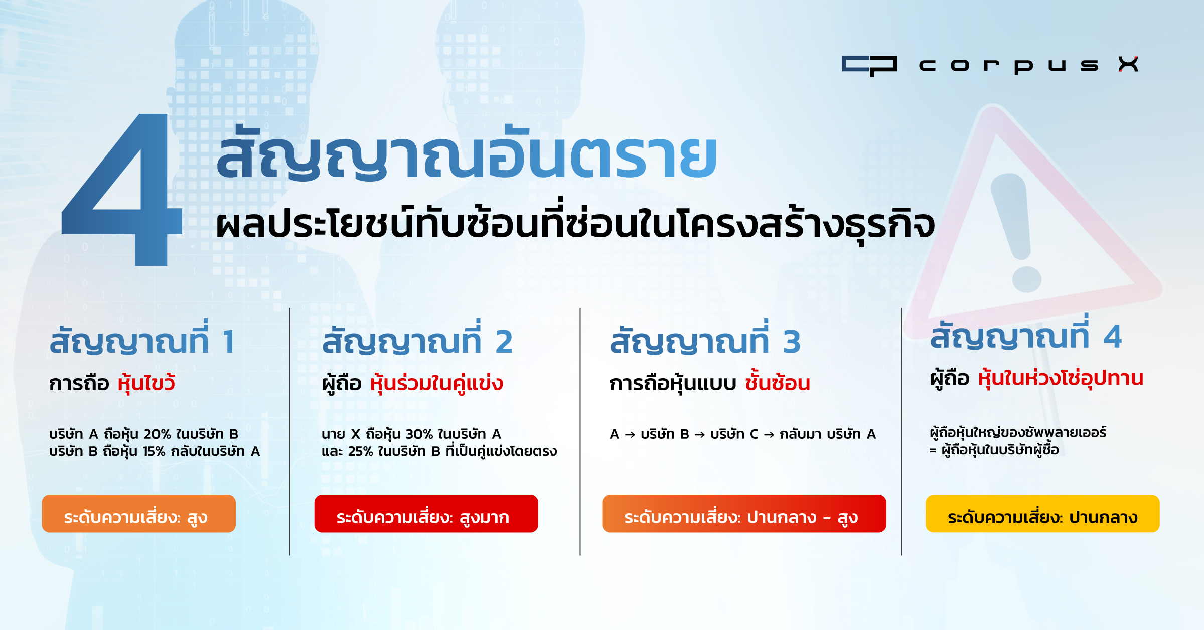ผู้ถือหุ้นร่วมในคู่แข่ง | นาย X ถือ 30% ในบริษัท A และ 25% ในบริษัท B ที่เป็นคู่แข่งโดยตรง | สูงมาก |