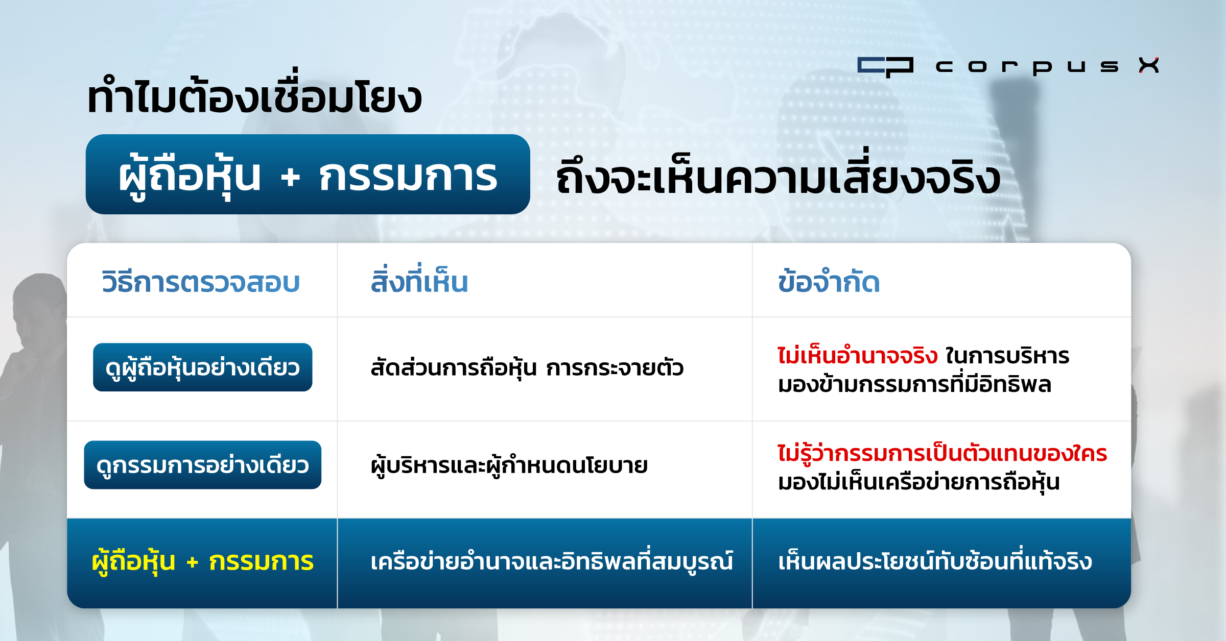 ผู้ถือหุ้น + กรรมการ | เครือข่ายอำนาจและอิทธิพลที่สมบูรณ์ | เห็นผลประโยชน์ทับซ้อนและความเสี่ยงที่แท้จริง |
