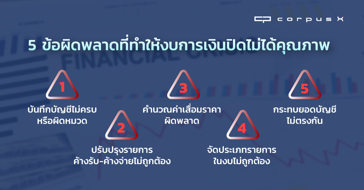 อย่างไรก็ตาม ปัญหาการปิดงบการเงินในทางปฏิบัติเกิดขึ้นได้ในหลายจุด ตั้งแต่การบันทึกรายการพื้นฐานไปจนถึงการจัดประเภทรายการในระดับงบการเงินรวม ข้อผิดพลาดที่ดูเล็กน้อยในตอนแรกสามารถสะสมจนกระทบความถูกต้องของงบกำไรขาดทุน งบกำไรขาดทุนเบ็ดเสร็จ และงบการเงินเฉพาะกิจการ ซึ่งนำไปสู่การวิเคราะห์ธุรกิจที่คลาดเคลื่อนได้ บทความนี้รวบรวม 5 ข้อผิดพลาดที่พบบ่อยที่สุด พร้อมแนวทางป้องกันที่นำไปปรับใช้ได้จริง