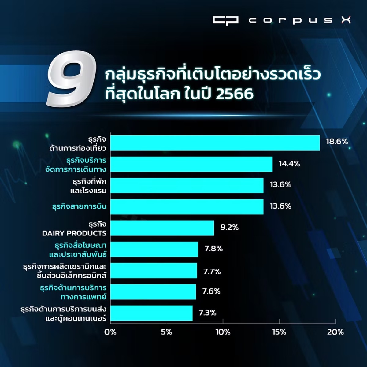 ในปี 2566 เป็นปีที่สถานการณ์ภาพรวมของธุรกิจต่างค่อย ๆ ฟื้นตัวขึ้นมาอีกครั้ง เสมือนเป็นฟ้าหลังฝนที่คนทำธุรกิจเริ่มเห็นแสงสว่างที่ปลายอุโมงค์ การเติบโตของรายได้เพิ่มขึ้นในหลายอุตสาหกรรม ซึ่งในปีที่ผ่านมากลุ่มธุรกิจที่น่าจับตามองที่ค่อนข้างหลากหลาย แต่หากมองถึงอัตราการเติบโตของรายได้ในปี 2566 ที่เติบโตขึ้นอย่างต่อเนื่อง Corpus X ได้รวบรวมข้อมูลกลุ่มธุรกิจที่มีรายได้เพิ่มขึ้นอย่างรวดเร็วที่สุดในโลกด้วยกัน 9 กลุ่มธุรกิจ