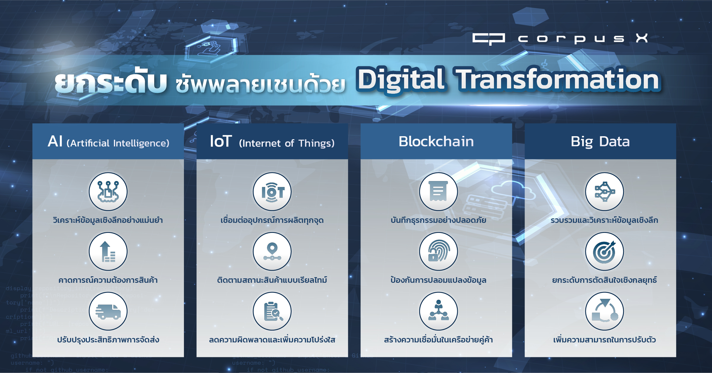 ในขณะเดียวกัน การนำ AI, IoT, Blockchain และ Big Data มาใช้ในซัพพลายเชนถือเป็นกุญแจสำคัญที่ช่วยเพิ่มความแม่นยำ ลดต้นทุน และเสริมสร้างความโปร่งใสในทุกขั้นตอนการทำงาน การปรับตัวด้วยดิจิทัลทรานส์ฟอร์เมชันนี้ไม่เพียงแต่ช่วยให้ธุรกิจแข่งขันได้อย่างมีประสิทธิภาพมากขึ้น แต่ยังเปิดโอกาสใหม่ ๆ ในการบริหารจัดการคู่ค้าได้อย่างชาญฉลาด ผ่านแพลตฟอร์มอย่าง Corpus X ที่ช่วยวิเคราะห์และค้นหาคู่ค้าที่มีศักยภาพสูงได้อย่างแม่นยำและรวดเร็ว